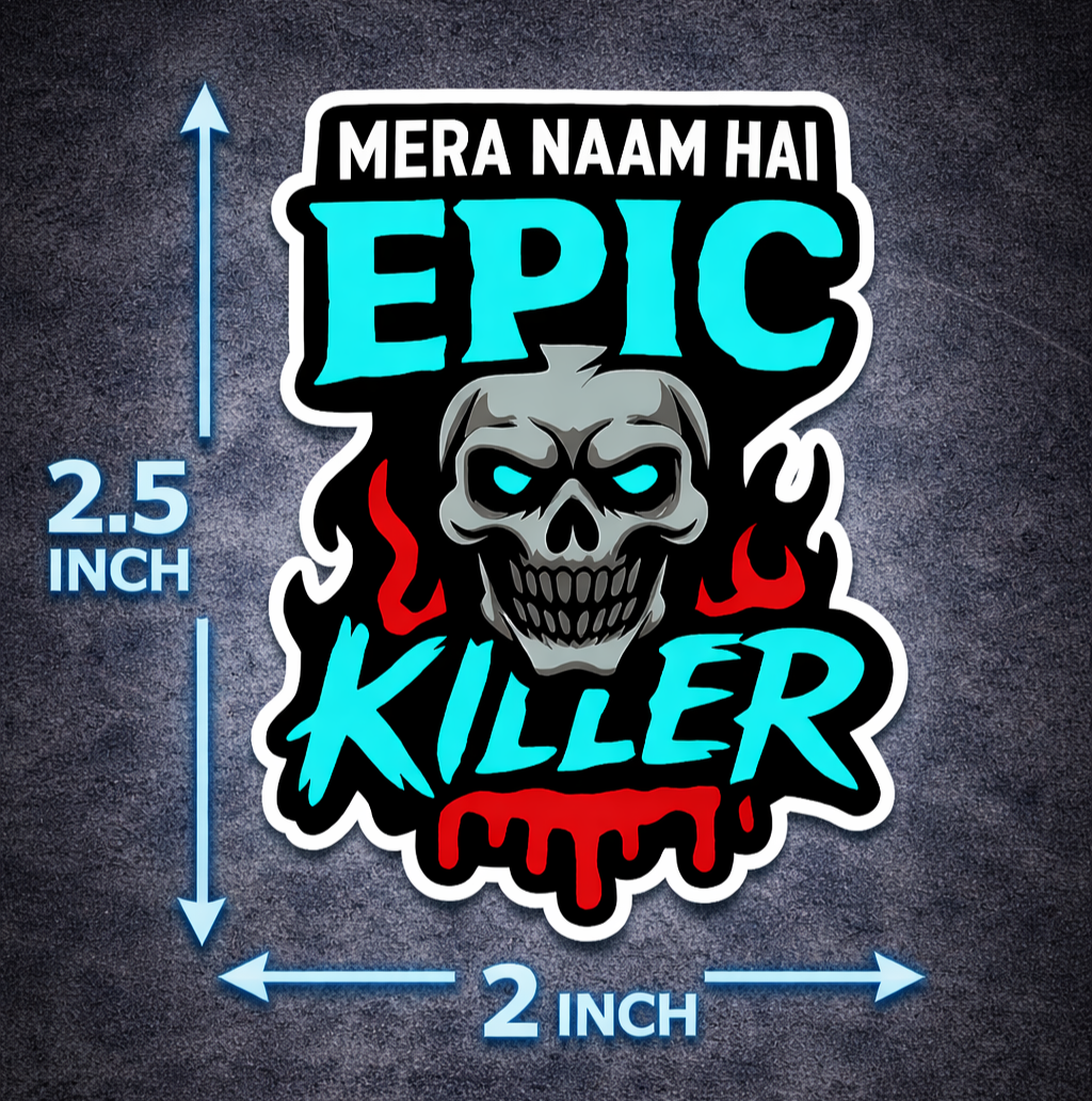 Premium vinyl sticker pack with 5 exclusive Epic Killer designs: "Mera Naam Hai EPIC KILLER," "BEN STRIKES," "SAMUDAY," "GULAMBI DVL," and "THAT WAS CRAAZYYYYY." High-quality vinyl with vibrant, fade-resistant colors. Perfect for laptops, water bottles, phone cases, and gaming gear. Strong adhesive removes without residue. Water-resistant, scratch-proof, and durable for indoor/outdoor use.